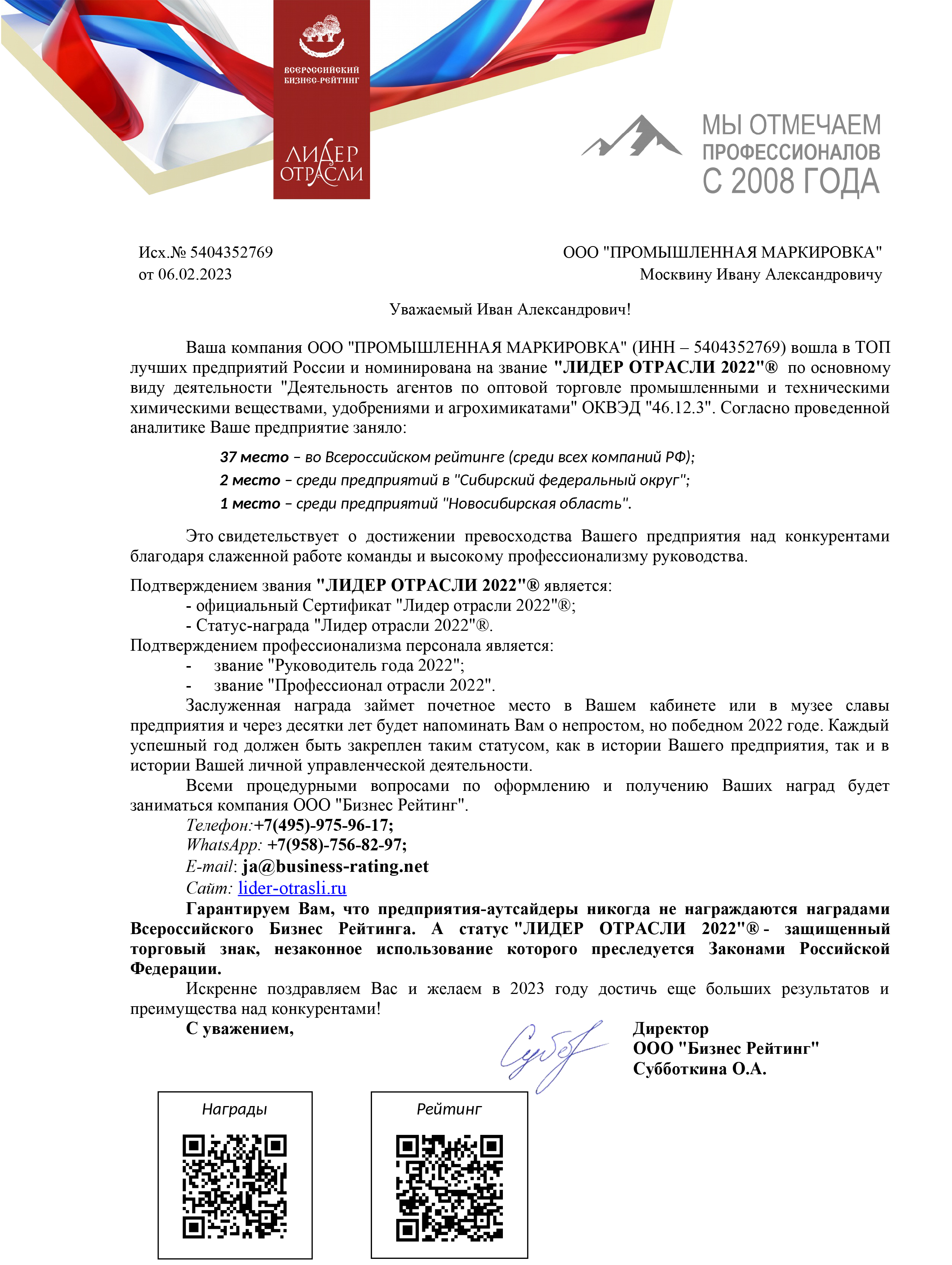 По итогам 2022 года компания вошла в ТОП лучших предприятий России и номинирована на звание ЛИДЕР ОТРАСЛИ 2022 по основному виду деятельности Деятельность агентов по оптовой торговле промышленными и техническими химическими веществами, удобрениями и агрохимикатами, ОКВЭД 46.12.3.